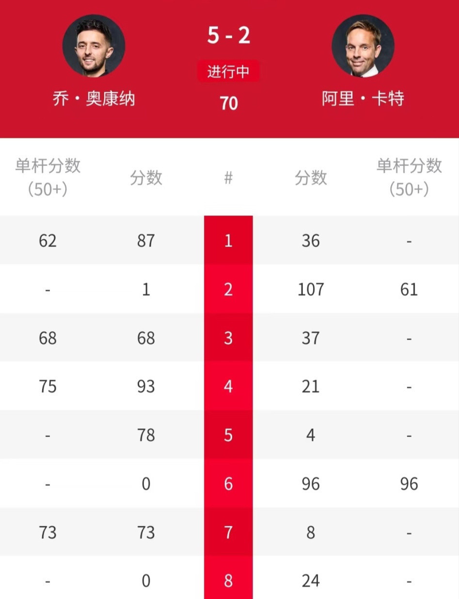 第二局,卡特迅速做出回应,他打出单杆61分,107-1/扳回一局,比分追成1-1。第三局,奥康纳再度发力,他又打出单杆68分,68-37赢下,2-1再次领先。